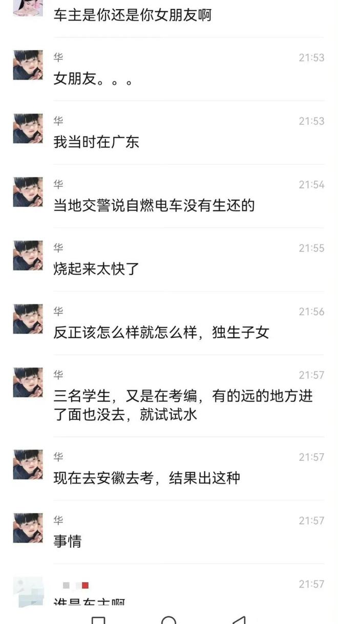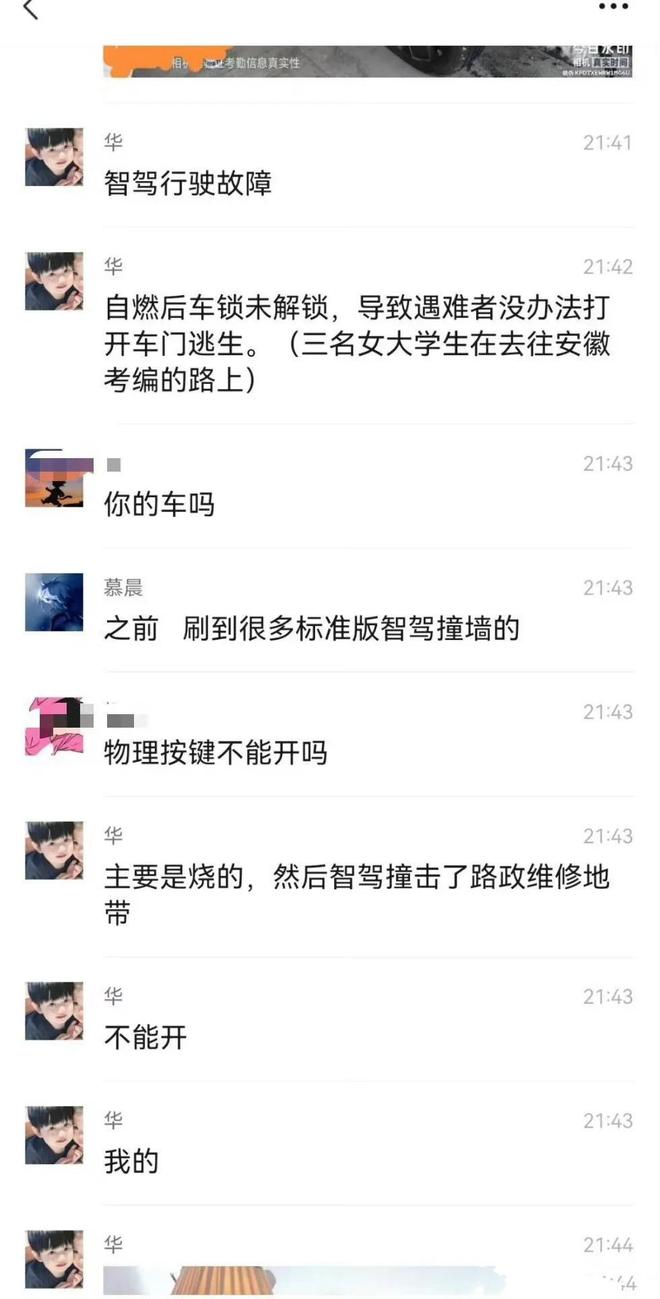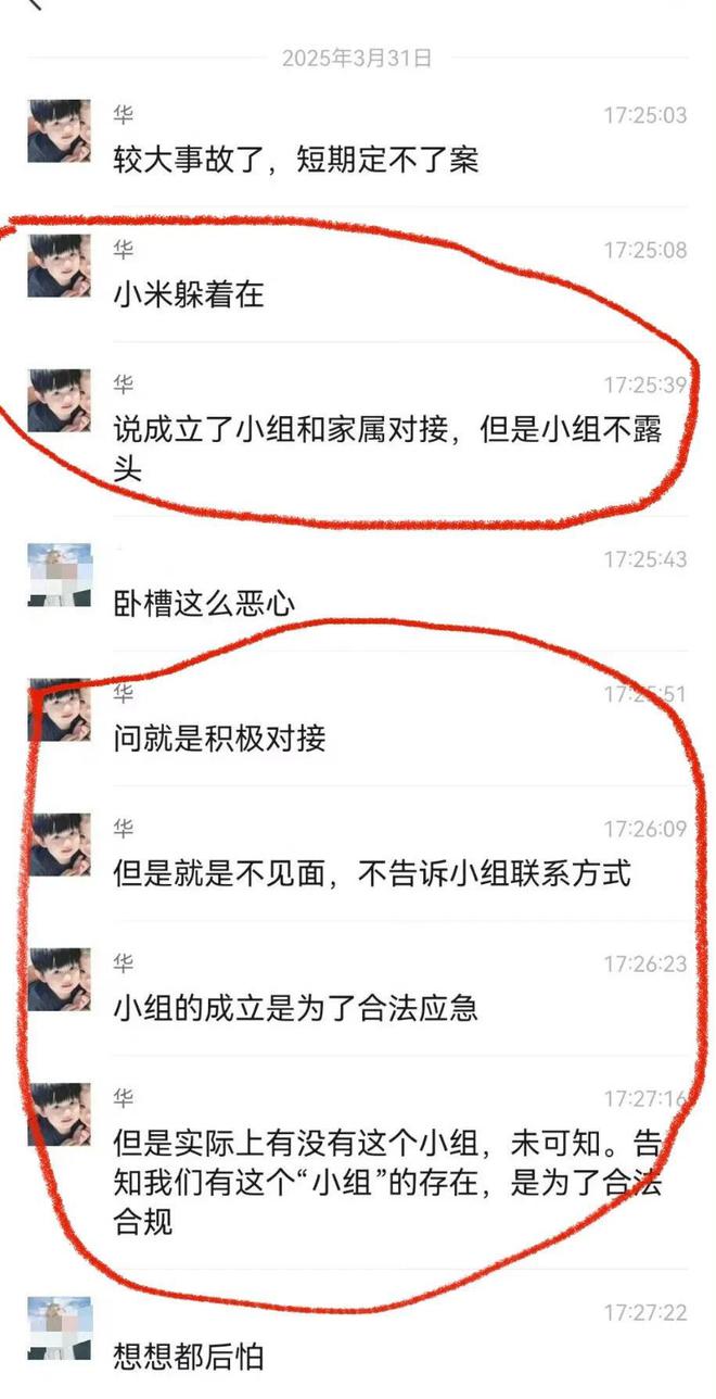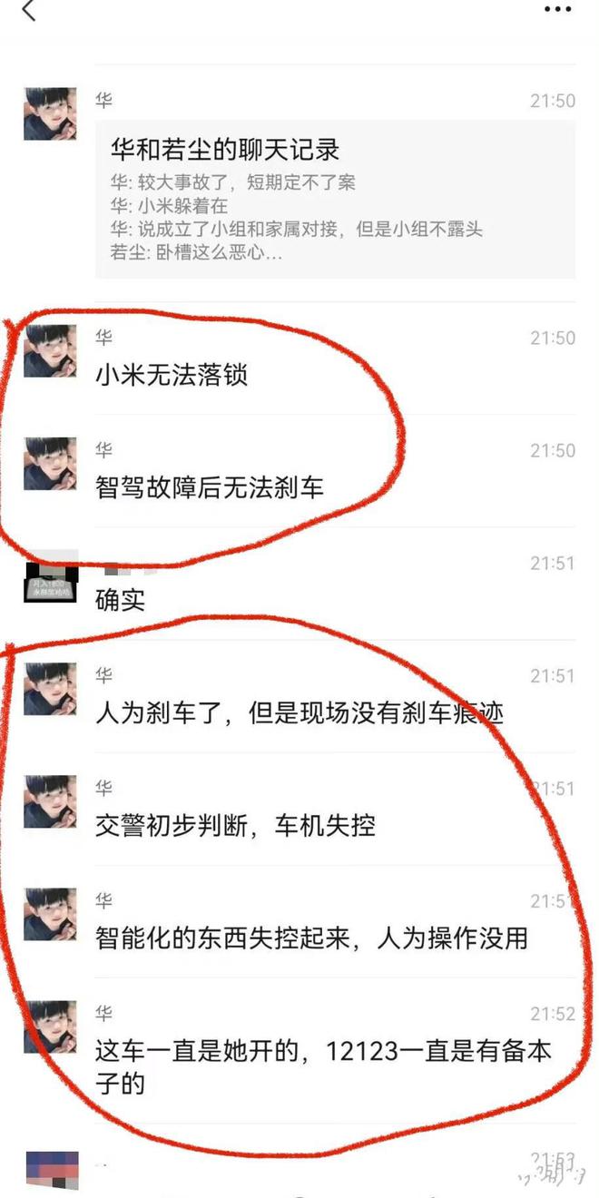 副驾女生的男朋友和小米见面后,选择相信对方会说到做到。但主驾女生的男友觉得小米成立的对接小组就是做做样子。从他3月31号的聊天记录能看出来,那时候雷军还没出来回应呢,他觉得这小组就是为了应付事儿。他还透露其中一名女生是独生子女,出事时他人在广东,女友开车去安徽,他没办法立刻赶过去救她。他翻来覆去强调是智驾故障、无法刹车、自燃太快,一口咬定是车企的责任。