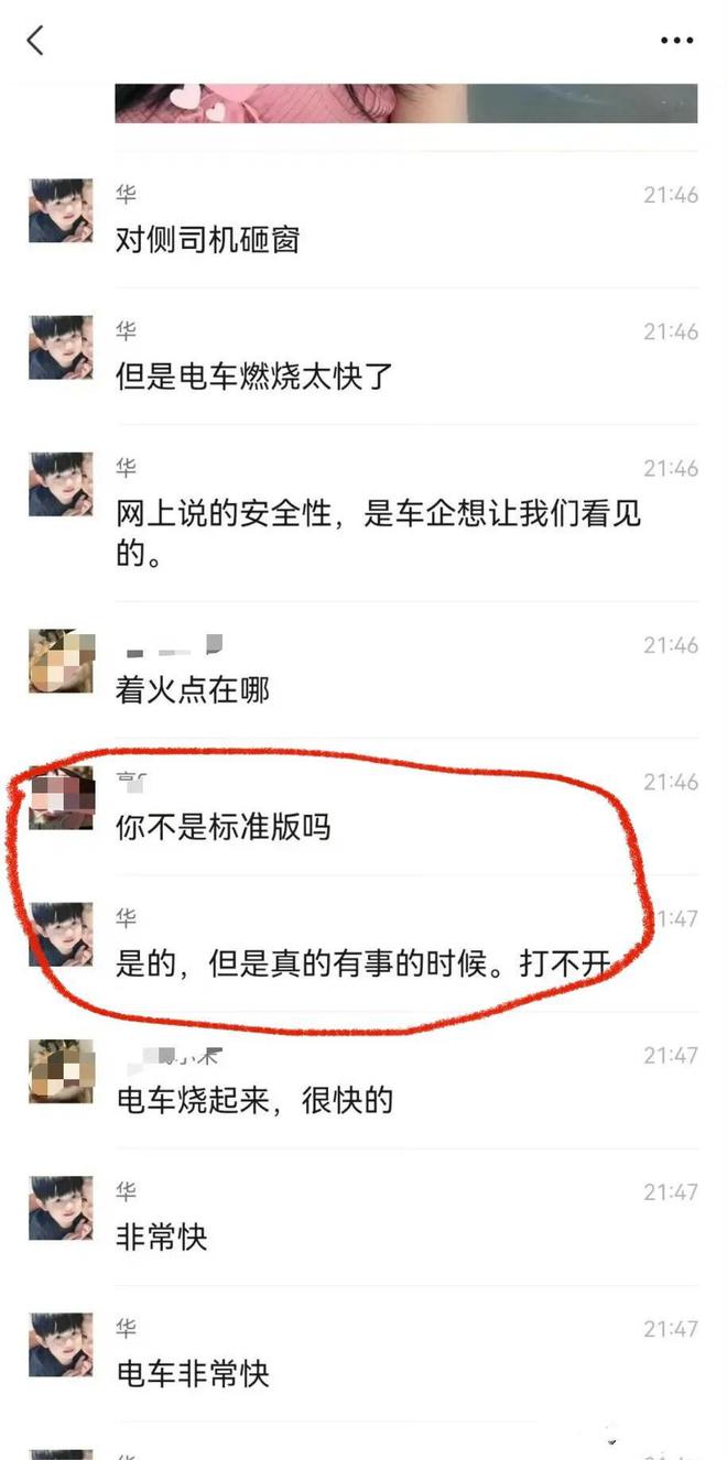 可主驾女生的男友却满肚子火,对小米的调查进度不满意,曝光了不少车祸后续细节。他说自己的车是标准版,本来有自动刹车和躲避障碍物的功能,关键时候却掉链子,根本打不开。还说电车自燃起来特别快。他越说越激动,称小米车还没法落锁,智驾功能一故障,不管是人为刹车还是功能自带刹车都没用。他信誓旦旦地说,女友当时踩了刹车,可车祸现场愣是一点刹车痕迹都没有,所以他认定智能化失控后,人为操作根本没用。他还把燃烧地的照片发群里,让大家帮忙瞅瞅有没有刹车痕迹。