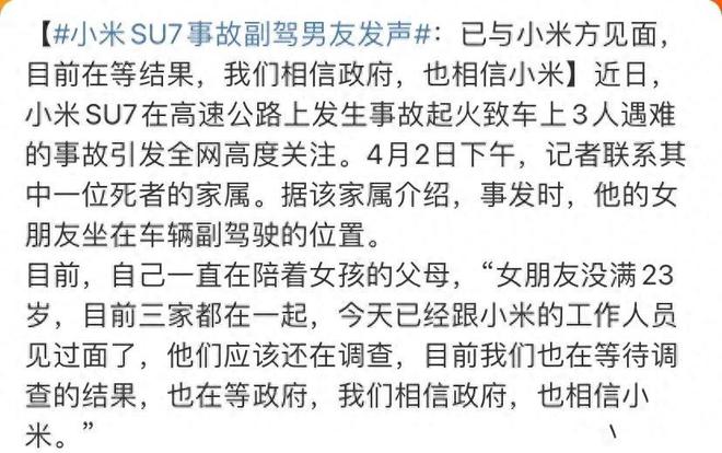 事情是这样的,4月2号晚上出了车祸。副驾女生的男友站出来说话了,他女朋友才22岁,比主驾女生年纪还小呢。出事后,他赶忙和女友父母聚到一起,到事故现场等着处理结果。他说雷军的小米集团挺负责,和三方家长都碰了面,没当缩头乌龟。不过调查结果还得花些时间,这男生很理智,表示相信政府和小米。