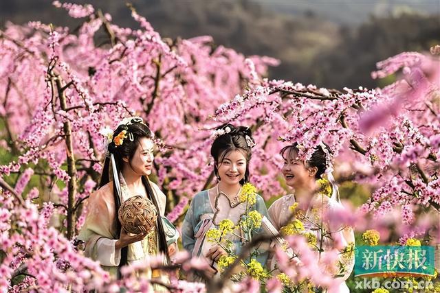 4月1日,汉服爱好者在贵州省贵定县德新镇新铺村黄桃基地游玩。