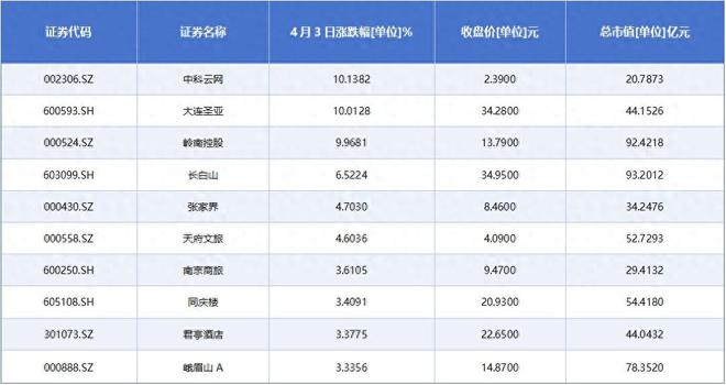 4月3日,A股三大指数集体下跌,旅游酒店板块逆势走强。其中,大连圣亚、岭南控股涨停,长白山、天府文旅、君亭酒店等个股纷纷跟涨。