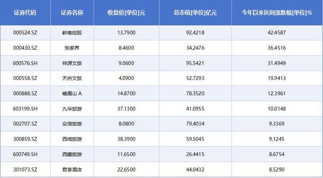 从二级市场表现看,今年以来涨幅超过10%的一共有6家公司,分别是岭南控股、张家界、祥源文旅、天府文旅、峨眉山A、九华旅游。