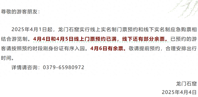 2025年4月1日起,龙门石窟实行线上实名制门票预约和线下实名制应急购票相结合游览制。4月4日和4月5日线上门票预约已满,线下还有部分余票。已预约的游客请按照预约时段刷身份证有序入园。4月6日有余票。
