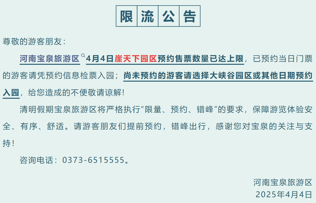 河南宝泉旅游区4月4日崖天下园区预约售票数量已达上限,已预约当日门票的游客请凭预约信息检票入园;尚未预约的游客请选择大峡谷园区或其他日期预约入园,请游客朋友们提前预约,错峰出行。