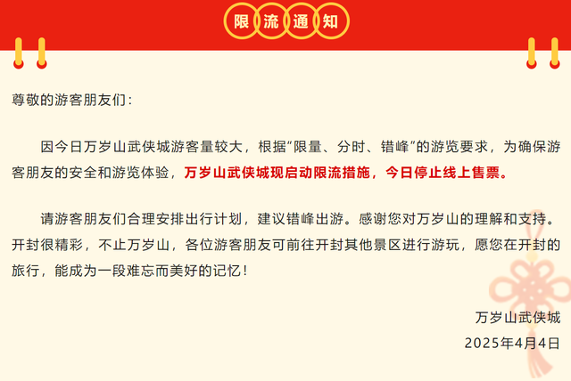 因今日万岁山武侠城游客量较大,根据“限量、分时、错峰”的游览要求,为确保游客朋友的安全和游览体验,万岁山武侠城现启动限流措施,今日停止线上售票。各位游客朋友可前往开封其他景区进行游玩。