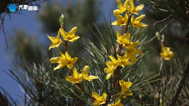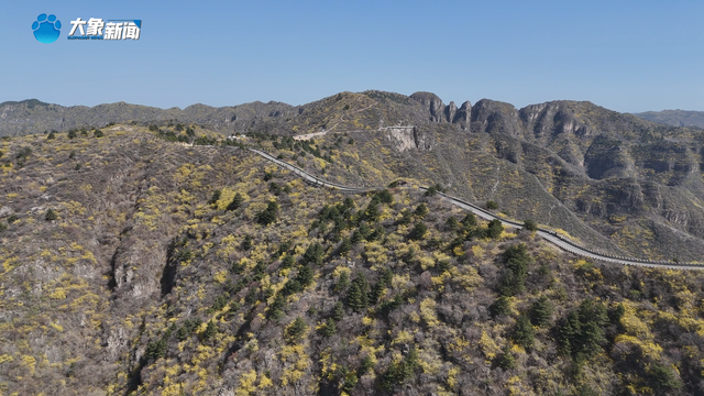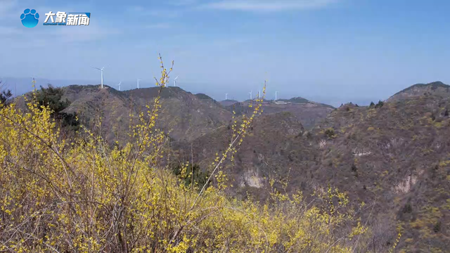 春到太行,万物生辉。在河南新乡卫辉市狮豹头乡,漫山遍野的野生连翘次第绽放,金黄花浪沿着山脊奔涌,与蓝天白云间转动的白色风车群相互唱和。