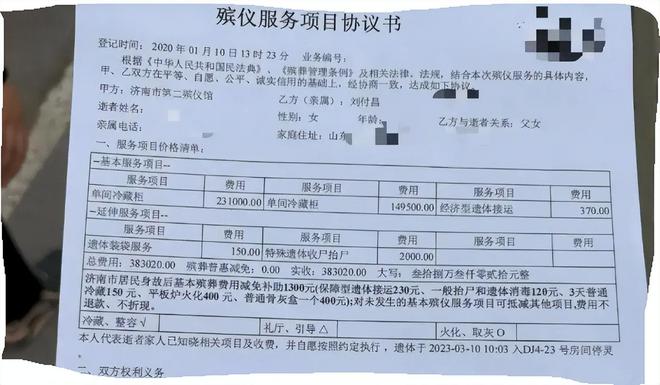 本以为这下能让女儿入土为安了,可2月27号,刘付昌去殡仪馆接女儿遗体,却被告知要交几十万元。3月26号再去,费用清单上,遗体接运、收尸抬尸、遗体冷藏,加起来38万多,光冷藏费就38万多。原来这几年,遗体一直存放在每天200元的单人单间冷藏柜里。