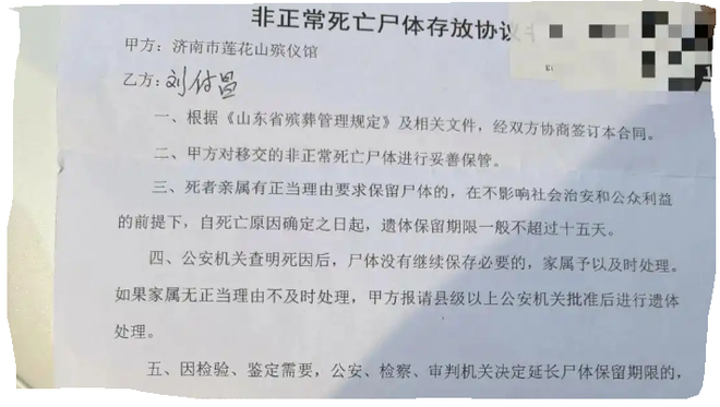 当晚联系不上女儿,刘付昌和家人赶忙从聊城老家赶到济南,第二天一早就报了警。警察顺着线索,很快锁定王康,找到了刘芸的遗体。警察把他们安置在派出所,傍晚说遗体要解剖,已经送殡仪馆了。第二天,刘付昌和家人去殡仪馆,按要求签了遗体存放协议,当时满心悲痛,根本没顾上问费用。