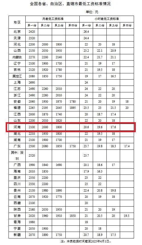 数据显示河南省月最低工资标准第一档、第二档、第三档分别为2100元、2000元、1800元河南省小时最低工资标准第一档、第二档、第三档分别为20.6元、19.6元、17.6元