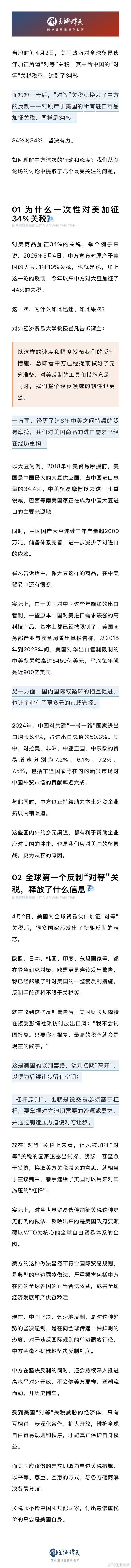 4月4日,中方11箭齐发,坚决反制美国加征的“对等关税”。其中,中方宣布,对原产于美国的所有进口商品加征34%关税。“34%”和“所有”都引发了舆论场的广泛讨论。谭主回答几个大家最关心的问题: