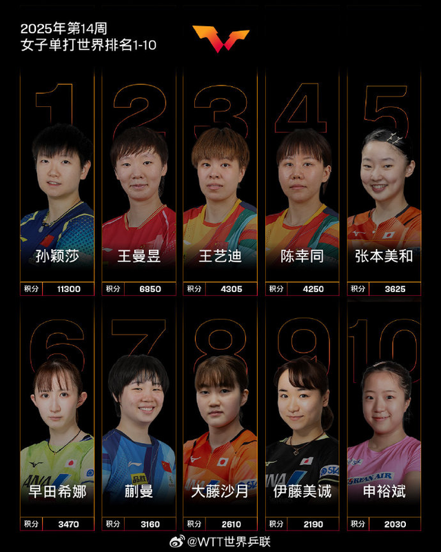 4月1日,国际乒联2025年第14周世界排名,女子单打方面,中国队球员孙颖莎、王曼昱、王艺迪、陈幸同位列前四,蒯曼位列第七。张本美和排名上升1个名次位列第五,刷新个人职业生涯新高,16岁的她成为日本女乒新一姐。