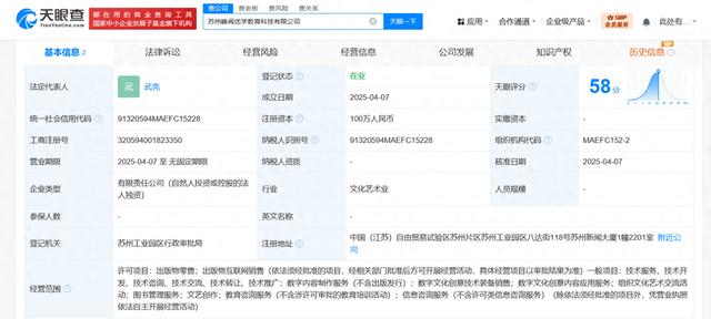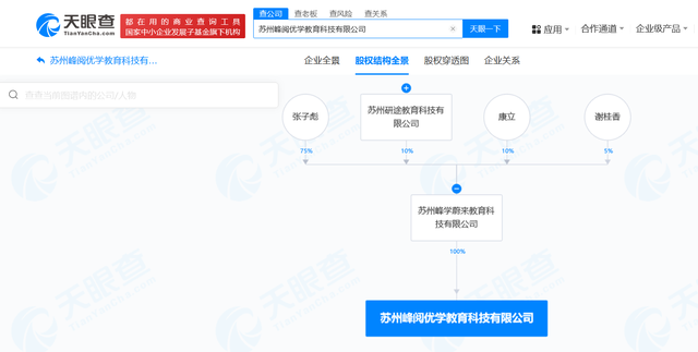 天眼查App显示,近日,苏州峰阅优学教育科技有限公司成立,法定代表人为武亮,注册资本100万人民币,经营范围含出版物零售、出版物互联网销售、数字内容制作服务、数字文化创意技术装备销售、数字文化创意内容应用服务、组织文化艺术交流活动、教育咨询服务等。股权全景穿透图显示,该公司由张子彪(张雪峰)持股75%的苏州峰学蔚来教育科技有限公司全资持股。