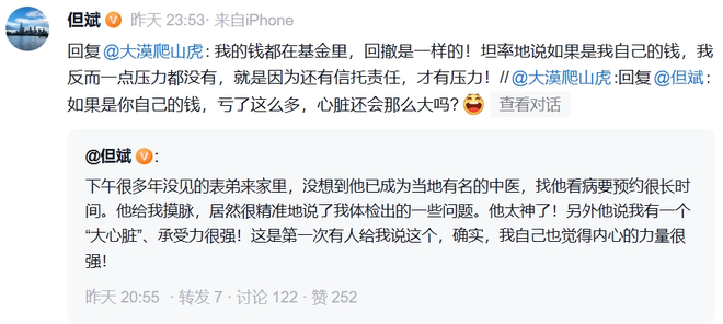 有意思的是,在 但斌另一条自称“ 觉得内心的力量很强”的帖子下方,有人留言称:“ 如果是你自己的钱,亏了这么多,心脏还会那么大吗?”
