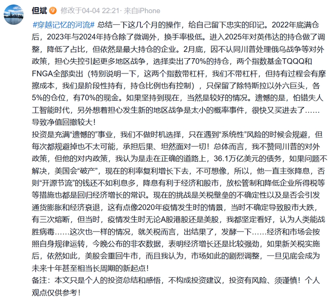 对此, 东方港湾创始人但斌在清明节当天发文总结这几个月的操作。