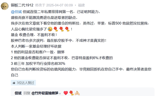 尽管有人不看好,但也有人在一篇题为《 但斌,从英伟达“战神”到纳指“囚徒”》的文章下夸赞但斌,称他不仅有能力,还有“ 比梁宏强多了”的 人品和心胸。