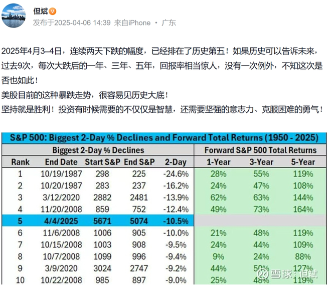 但斌发帖称,“ 2025年4月3–4日,连续两天下跌的幅度,已经排在了历史第五!……美股目前的这种暴跌走势,很容易见历史大底!”