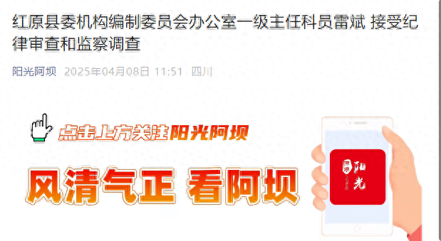 四川红原县委机构编制委员会办公室一级主任科员雷斌涉嫌严重违纪违法,目前正接受红原县纪委监委纪律审查和监察调查。