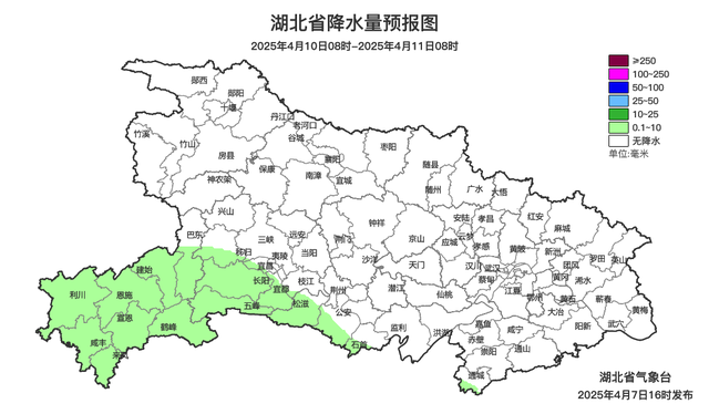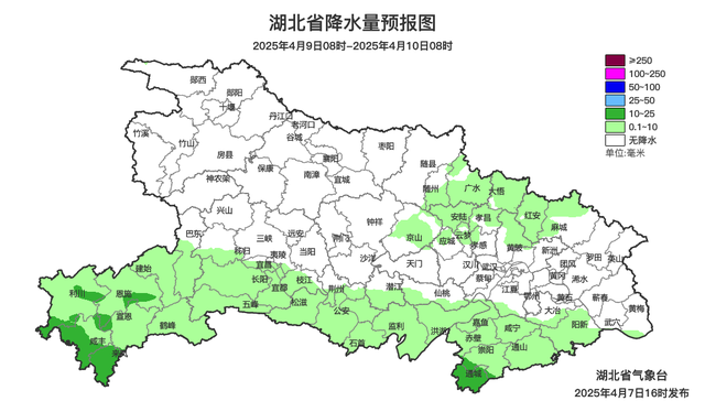 4月9日08时-10日08时,鄂西南、江汉平原南部、鄂东南阴天有小雨,局地中雨并伴有雷电;其他地区阴天到多云,局地有短时小雨。最高气温鄂西南24~28℃、其他地区28~33℃,最低气温西部10~15℃、中东部15~19℃,偏南风2到3级。