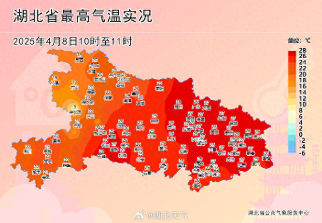 4月8日08时-9日08时,鄂西北南部、鄂东北西部多云,局地有短时小雨;其他地区多云间晴天。最高气温28~32℃,最低气温西部12~15℃、中东部15~19℃,偏南风2到3级。