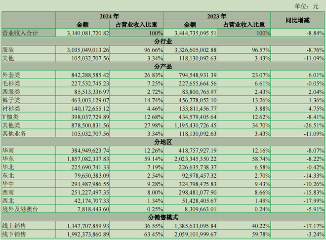男装品牌七匹狼(002029.SZ)把2024年定为推进品牌焕新战略的关键一年,表示笃定目标,聚焦“夹克专家”核心品牌定位不动摇,推进各项业务发展。反映到七匹狼的业务板块,所有的销售区域以及线上线下销售的营收,同比都是下滑,大部分产品营收也是下滑,而投资理财以及炒股的盈利,撑起了七匹狼2024年业绩的大半壁江山。炒股理财一年进账超2.36亿元年报披露,七匹狼的夹克荣列2023年度同类产品市场综合占有率第一位并荣列24年(2000-2023)同类产品市场综合占有率第一位,入围“2023中国服装行业百强企业”、荣获“福建省创新型民营企业100强”、“MUSE设计奖银奖”等荣誉。并通过类直营管理模式,实现对合作门店的标准化管控。在数字化战略布局中深度整合多维销售渠道,线下持续优化门店布局,线上领域积极打造数字化触点,与主流电商平台建立战略合作,并率先布局社交电商新阵地。不过整体的营销网络、营销模式等等,体现在经营数据这个末端也是最直观的反应上,七匹狼所有的销售区域,以及线上线下渠道,营收都是同比下降。旗下产品分类中,营收增长和下降也是对半开。为何在推进品牌焕新战略的关键一年却没有取得理想的经营业绩?时代周报向七匹狼发去采访函,未获回应。在金融资产投资上,七匹狼在当下的股市还是获得了不错的收益。10个债券、股票等理财投资,2024年收益超2.36亿元。年报披露,七匹狼除了主标“七匹狼”产品以外,还经营国际轻奢品牌“Karl Lagerfeld”。Karl Lagerfeld是时尚界重量级人物、知名服装设计师“老佛爷”Karl Lagerfeld的同名品牌。在收购当年,Karl Lagerfeld被纳入上市公司合并报表,由现任董事周力源任Karl Lagerfeld品牌负责人,负责Karl Lagerfeld品牌整体战略的制定及执行。周力源2018年进入入公司担任总经理助理,全线负责集团潮流品牌业务。2019年成为七匹狼董事。2024年,Karl Lagerfeld营收3.76亿元,但是重新变为亏损2700余万元。2024年报披露,报告期内,Karl Lagerfeld品牌通过视觉发布、快闪活动及达人探店、明星艺人穿搭演绎及街拍等一系列营销活动诠释酷雅美学。推出以Karl Lagerfeld先生热爱的加州及好莱坞文化为主题的24春夏系列,启迪当下大热的城市轻运动的生活方式;2024年9月,Karl Lagerfeld发布了2024秋冬大片,以当代视角重新诠释经典。Karl Lagerfeld还推出蓝调系列产品,通过革新环保工艺,将绿色理念巧妙融入剪裁与面料,用环保工艺为时装注入新灵感。