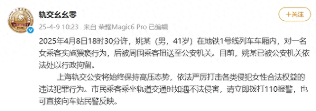 4月8日18时30分许,姚某(男,41岁)在地铁1号线列车车厢内,对一名女乘客实施猥亵行为,后被周围乘客扭送至公安机关。目前,姚某已被公安机关依法处以行政拘留。