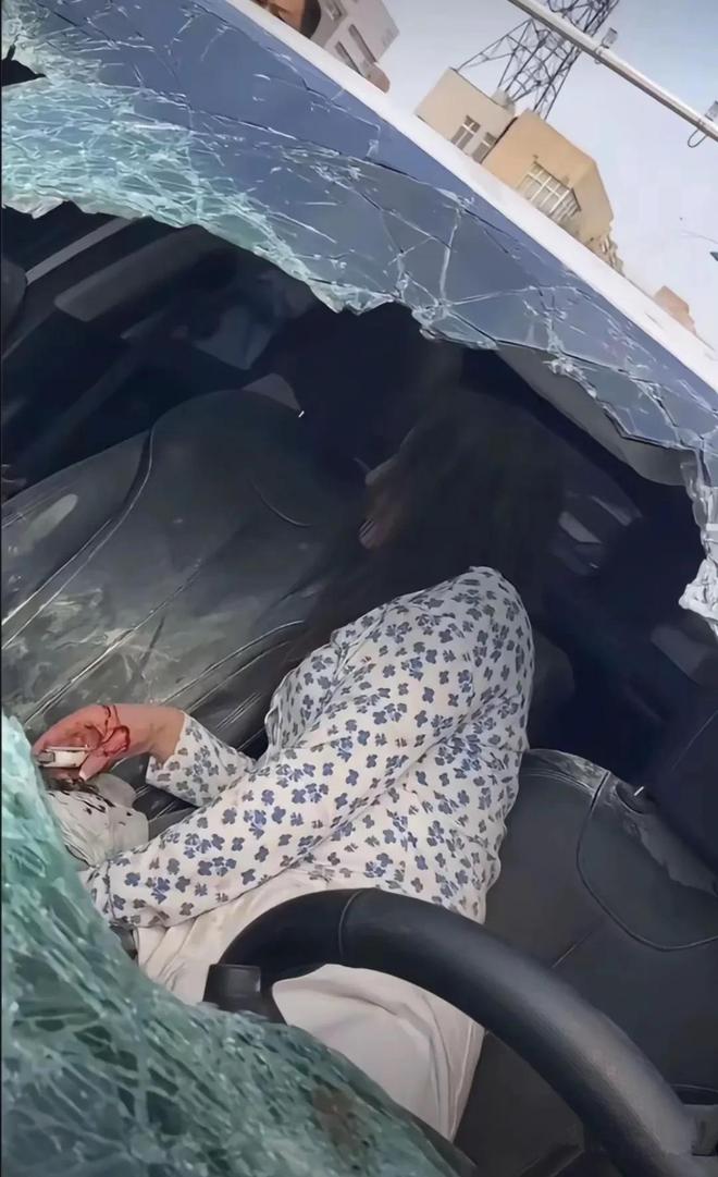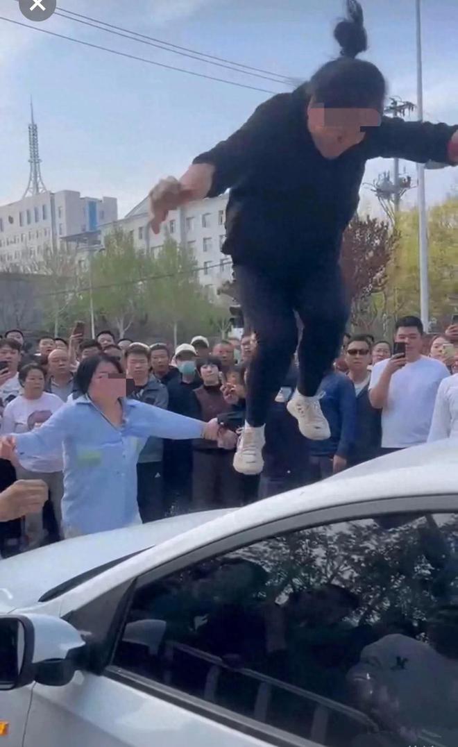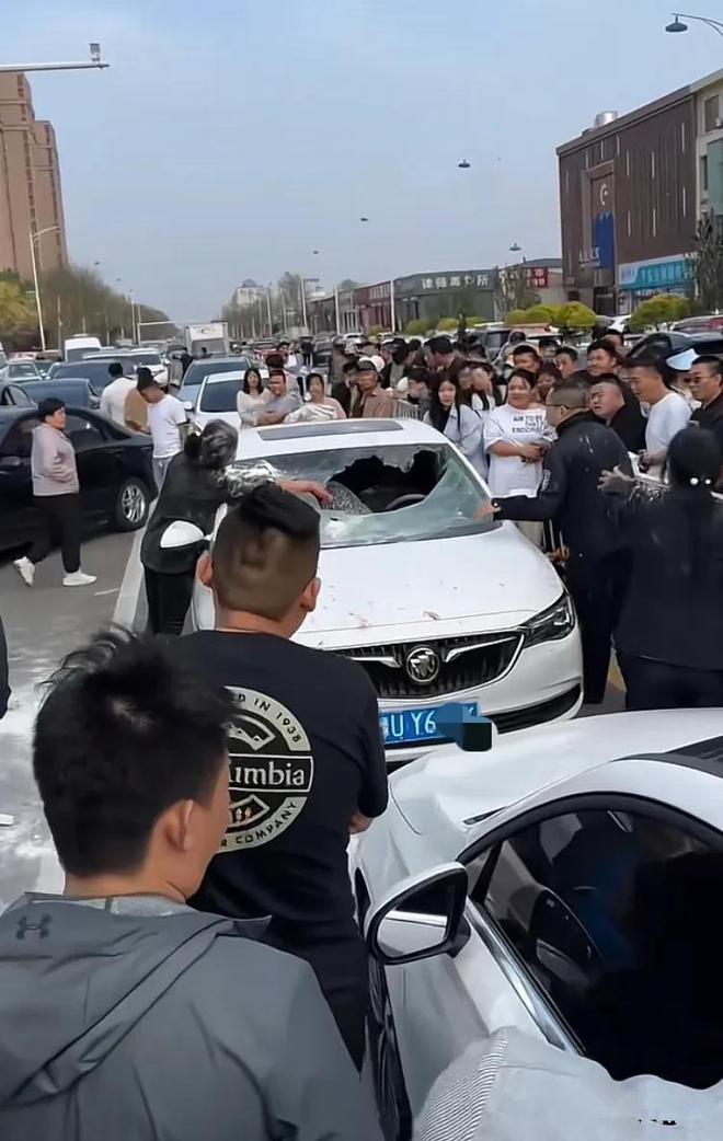 大姐一看他们不下来,火气更大了,不知道从哪儿抄起个灭火器,对着前挡风玻璃就砸下去,“砰”的一声,玻璃上立马裂了好几道缝。周围路过的人都停下脚步看热闹,路上的车也堵成了一堆,司机们都探出头来瞧,好多人还掏出手机拍视频。大姐砸完玻璃还不解气,直接爬到了车引擎盖上,稍微顿了顿,然后朝着那块裂了的玻璃就跳了下去,“咔嚓”一声,玻璃被踩出个老大的窟窿。副驾的姑娘吓得脸都白了,手也被玻璃划到了,鲜血直流,整个人缩在座位上,不知所措的。