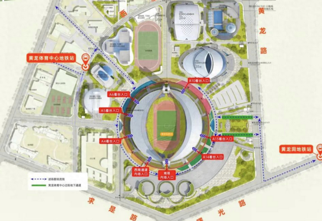 B口出站后步行途经曙光路-黄龙路-东广场抵达黄龙体育中心体育场