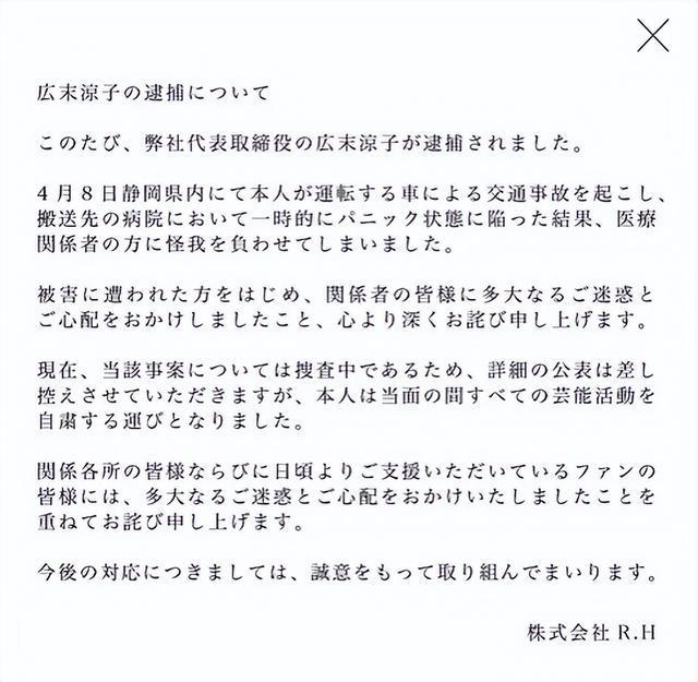 随后,广末凉子所属事务所官网发布声明,确认了广末凉子被捕这一事实:“4月8日在静冈县内发生了由本人驾驶的汽车引起的交通事故,在被送往医院的医院中一时陷入恐慌状态,结果导致医疗相关人员受伤。给受害的各位以及相关人员带来了很大的麻烦,我从心底表示歉意。目前该案件正在调查中,暂不公布详细情况,但目前将停止一切演艺活动。”