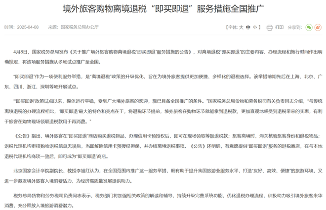 值得注意的是,在关税冲击下,国家税务总局周二宣布,境外旅客购物离境退税“即买即退”服务措施即日起在全国范围内推广。