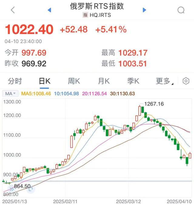 当地时间4月10日,俄罗斯股市大涨,俄罗斯RTS指数涨超5%,MOEX指数涨超4%。