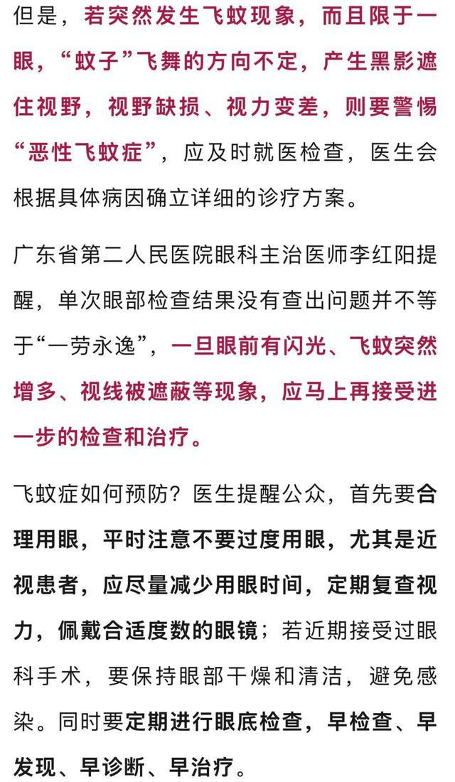 “飞蚊症”是不是严重的病变?据介绍,飞蚊症大多数是生理性的,也称为良性的。如果患者单眼或者双眼出现飞蚊现象,经过专业眼科医师的检查未发现眼内器质性病变,经过一段时间观察,这些现象并没有加重或产生变化,飞蚊位置也固定的话,多为良性。这些良性“飞蚊”常见的形状是纤维条索状、Weiss环、云雾状。