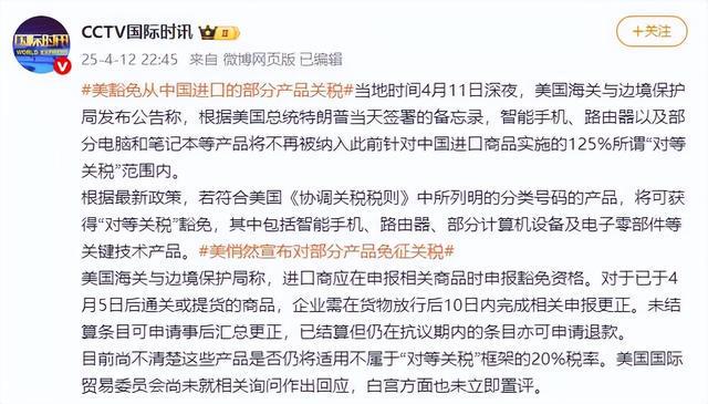另据@环球时报,有美媒提到,苹果的iPhone手机等许多电子产品都在中国生产,但报道没有提到中国产电子产品是否在免除范围内。科技网站wccftech则称,“根据我们对文件的解读,豁免条款中没有提及针对中国的条款,这意味着来自该地区的智能手机和个人电脑产品不会被征收145%的关税。这是一个重大进展。”