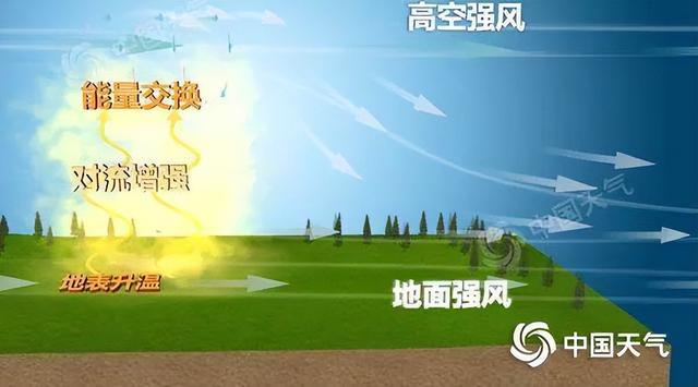 此外,高空动量下传还会使风力更强。在春季,高空往往还是冬季的环流形势,等高线密集,高空风速大,当天气晴朗,地表快速被加热后,地表附近的空气受热膨胀上升,在垂直方向形成湍流交换,把高空的大风传导到地面,导致出现地面强风。