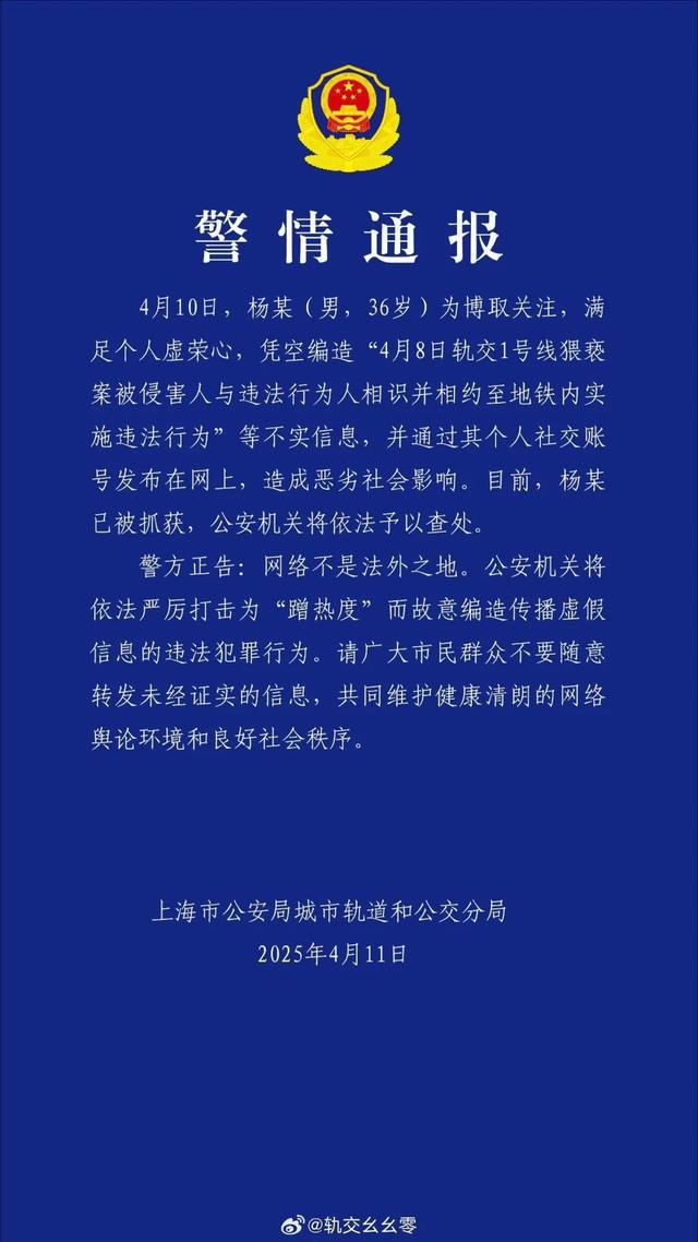 4月11日,上海市公安局城市轨道和公交总队再度发布通报:4月10日,杨某(男,36岁)为博取关注,满足个人虛荣心,凭空编造“4月8日轨交1号线猥亵案被侵害人与违法行为人相识并相约至地铁内实施违法行为”等不实信息,并通过其个人社交账号发布在网上,造成恶劣社会影响。目前,杨某已被抓获,公安机关将依法予以查处。