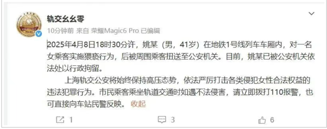 4月9日,上海市公安局城市轨道和公交总队发布通报:实施猥亵行为的姚某(男,41岁)已被依法处以行政拘留。