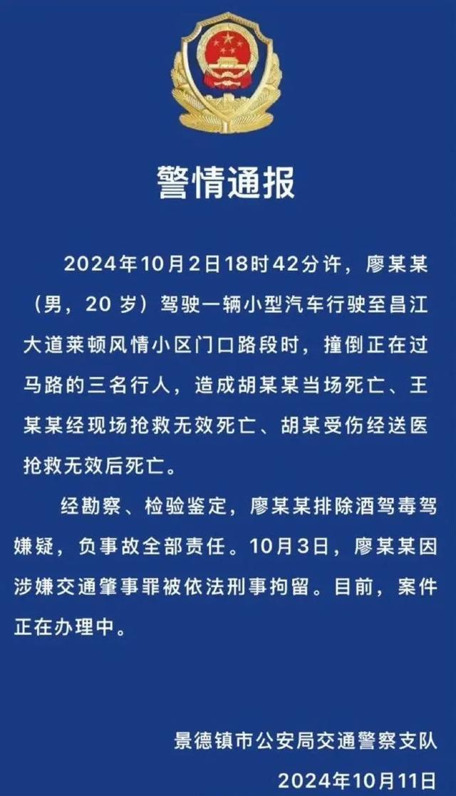 2024年10月11日,江西景德镇市公安局交通警察支队发布警情通报,称经勘察、检验鉴定,肇事者廖某某排除酒驾毒驾嫌疑,负事故全部责任。10月3日,廖某某因涉嫌交通肇事罪被依法刑事拘留。而后,廖某某因涉嫌以危险方法危害公共安全罪被检察院批准逮捕。