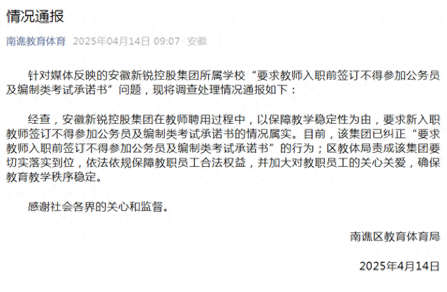 针对媒体反映的安徽新锐控股集团所属学校“要求教师入职前签订不得参加公务员及编制类考试承诺书”问题,现将调查处理情况通报如下:经查,安徽新锐控股集团在教师聘用过程中,以保障教学稳定性为由,要求新入职教师签订不得参加公务员及编制类考试承诺书的情况属实。