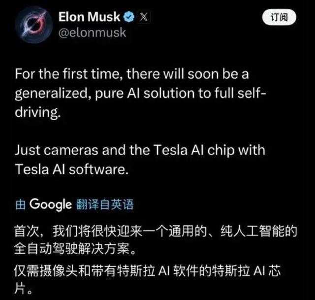 4月15日消息,特斯拉CEO埃隆•马斯克在其社交媒体发文称,特斯拉很快将实现一种通用的、纯AI的全自动驾驶(FSD)解决方案。