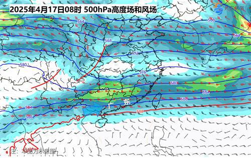 17日,高空槽东移影响广东北部,同时低层南风加大,广东自西向东云量增多,有阵雨。