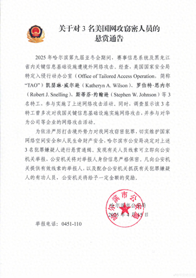 2025年4月15日,哈尔滨市公安局发布通告:2025年哈尔滨第九届亚冬会期间,赛事信息系统及黑龙江省内关键信息基础设施遭境外网络攻击。经查,美国国家安全局特定入侵行动办公室(Office of Tailored Access Operation,简称“TAO”)凯瑟琳·威尔逊(Katheryn A. Wilson)、罗伯特·思内尔(Robert J. Snelling)、斯蒂芬·约翰逊(Stephen W. Johnson)等3名特工,参与实施了上述网络攻击活动。同时,调查显示该3名特工曾多次对我国关键信息基础设施实施网络攻击,并参与对华为公司等企业的网络攻击活动。