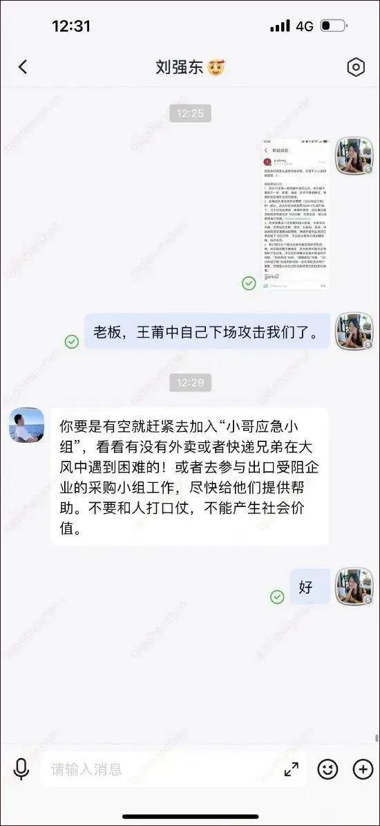 京东集团创始人刘强东对王莆中的言论回应称:要是有空就赶紧去加入“小哥应急小组”,看看有没有外卖或者快递兄弟在大风中遇到困难的!或者去参与出口受阻企业的采购小组工作,尽快给他们提供帮助。