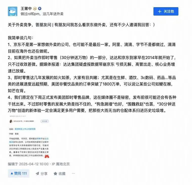 此前据媒体报道,美团本地商业CEO王莆中在社交平台发文,回应京东做外卖:“京东不是第一家想做外卖的公司,也可能不是最后一家。阿里、滴滴、字节不是都做过,滴滴目前在海外也还在做呢。”