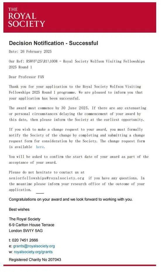 英国皇家学会(Royal Society)成立于1660年,是英国最高同时最具名望的科学学术机构。英国皇家学会沃尔夫森奖学金是由英国皇家学会设立的一项重要科研资助计划,该计划涵盖领域仅限于生物研究、化学、工程、数学和物理领域,仅支持海外研究人员申请,旨在支持世界领先的科学家到英国的大学或科研机构开展研究。该计划每年全球支持人数不超过15人,获得该计划支持的候选人有资格通过快速审核程序获得全球人才签证。