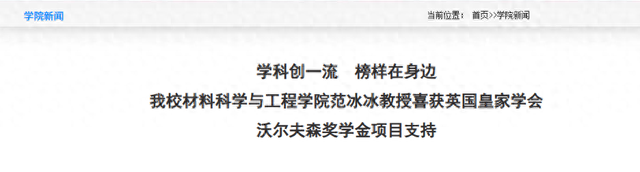 郑州大学材料科学与工程学院网站今年3月3日刊文《学科创一流 榜样在身边——我校材料科学与工程学院范冰冰教授喜获英国皇家学会沃尔夫森奖学金项目支持》。