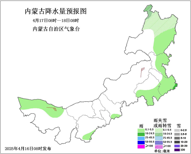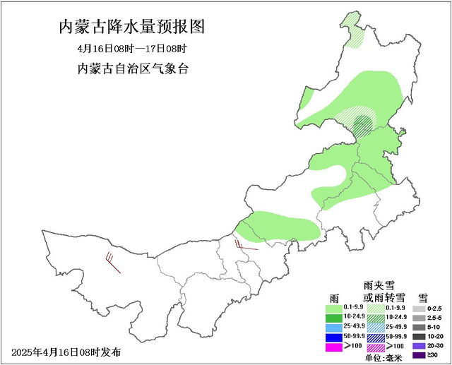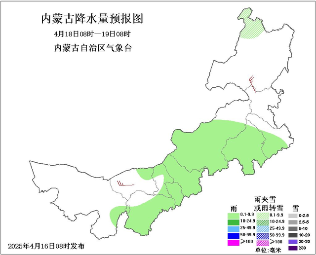 预计今天(4月16日),中部偏东及东部大部地区有小雨或雨夹雪,兴安盟西北部、呼伦贝尔市西南部部分地区有中雨或雨夹雪,中西部大部和东部偏西地区有4、5级短时6、7级局地8、9级西北风或偏南风,西部和中部偏西地区伴有沙尘天气。明天,西部偏北、东部大部地区有雨雪,西部大部、中部偏东和东部地区有短时6、7级局地8、9级大风。今天,中西部各主要城市最高气温在21℃~26℃之间,不过受弱冷空气影响,今明两天,内蒙古由西至东降温4~6℃,局地降温6℃以上。在其干扰下,部分城市最高气温回落至15℃左右。