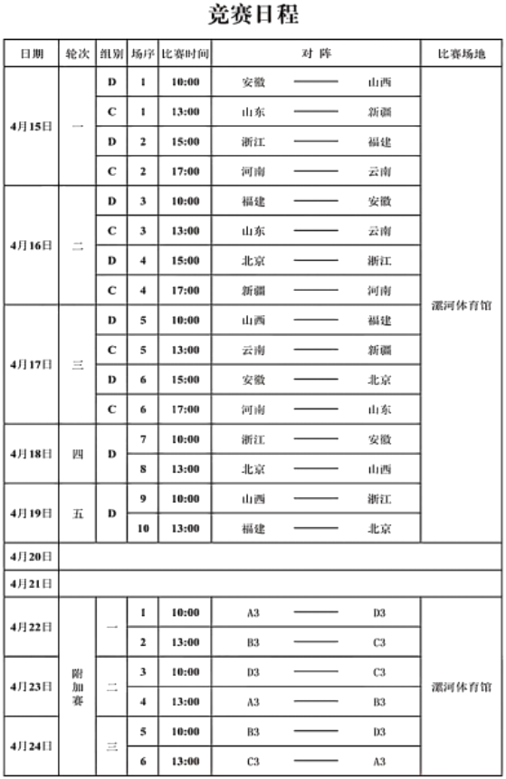 本次赛事由国家体育总局排球运动管理中心主办,河南省体育局、漯河市人民政府承办,河南省球类运动中心、漯河市体育局、漯河市体育中心协办。此次比赛作为全运会排球项目的重要选拔环节,肩负着为全国最高水平综合性运动会挖掘和储备优秀青年排球人才的重任。比赛期间,来自河南、山东、新疆、云南、北京、浙江、安徽、山西、福建等地的9支队伍,共155名运动员将在4月15日至19日展开激烈角逐,争夺晋级机会。随后,4月22日至24日还将举行A、B、C、D四组第三名队伍之间的附加赛。