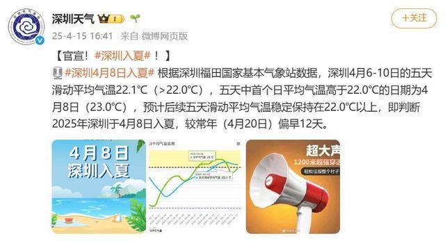 深圳市气象局4月15日宣布,根据深圳福田国家基本气象站数据,深圳4月6日-10日的五天滑动平均气温22.1℃(>22.0℃),五天中首个日平均气温高于22.0℃的日期为4月8日(23.0℃),预计后续五天滑动平均气温稳定保持在22.0℃以上,判断2025年深圳于4月8日入夏,较常年(4月20日)偏早12天。