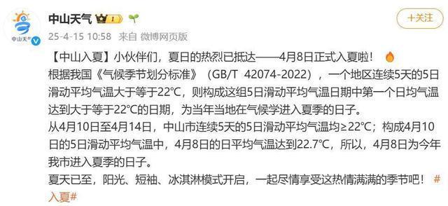在深圳官宣入夏的同一天,中山市气象局也宣布,从4月10日至4月14日,中山市连续5天的5日滑动平均气温均≥22℃;构成4月10日的5日滑动平均气温中,4月8日的日平均气温达到22.7℃,所以4月8日为2025年中山进入夏季的日子。