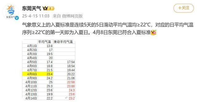 此外,东莞也在4月15日官宣4月8日为“入夏日”。