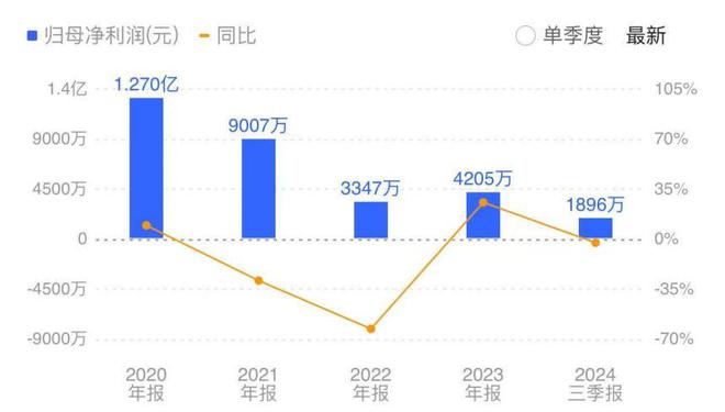 根据财报,2021年至2024前三季度,润阳科技净利润分别为9007万元、3347万元、4205万元、1896万元,同比增长-29.05%、-62.84%、25.66%、-2.57%。
